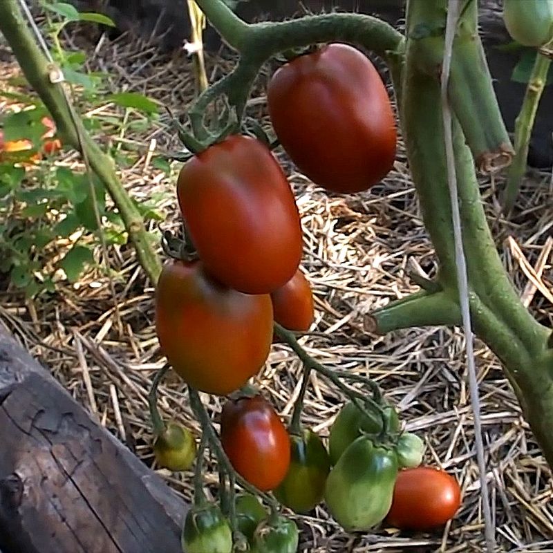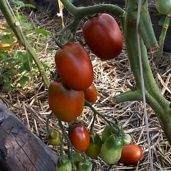 Плоди сливовидної (яйцевидної) форми, з товстими стінками, м'ясисті, темно-бордового кольору (деякі вважають за краще говорити фіолетово-коричневого кольору або темної вишні), масою 60-70 грам. У незрілих плодів може бути зелена пляма у плодоніжки. Перше суцвіття над 9-11 листком, що йде через 3 листки.