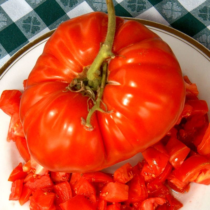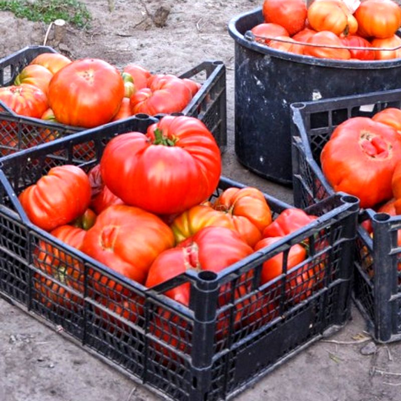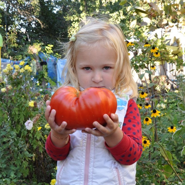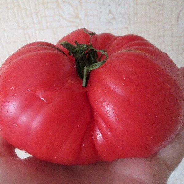 Плоди плоскоокруглі, у стадії зрілості насиченого рожевого кольору, вагою 400-700 г (до 1,5 кг). Деяким садівникам вдалося отримати плоди вагою 1,5-2,5 кг. М'якоть плодів м'ясиста, дуже смачна. Посів насіння на розсаду проводять за 60-65 днів до передбачуваної висадки в ґрунт. При висадженні розсади на місце на 1 кв. м розміщують трохи більше 3-х рослин.