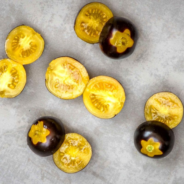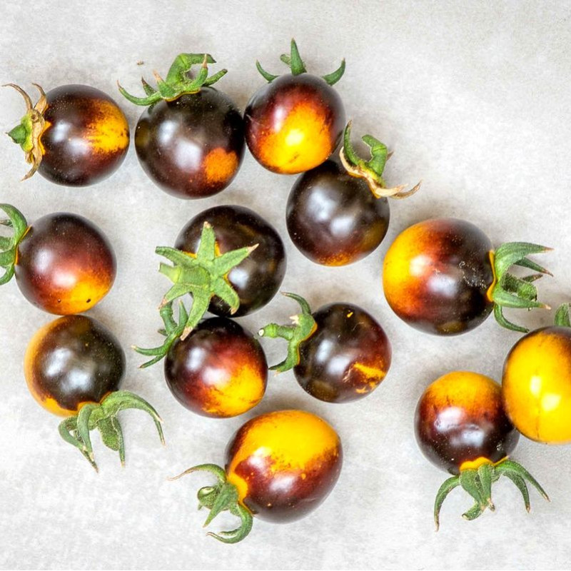 Томат «Синій лісовий джміль» - рідкісний привабливий томат, яскраво-жовтий, із синьою мармуровою плямою біля ніжки. Плоди стають синьо-фіолетовими в міру їхнього дозрівання, і чим більше сонця отримує кожен помідор, тим глибше стає цей колір.