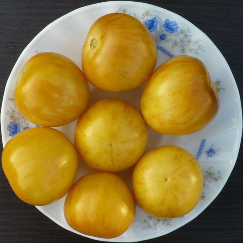 Томат «Вернісаж жовтий» - індетермінантний, високорослий, середньоранній сорт для відкритого ґрунту. Період вегетації – 110-120 днів.Плоди масою 40-60 грам. Томати круглі, яскраво-жовтого кольору, темно- жовту і помаранчеву смужку. В'яжуться гронами - пензель простий, компактний з 5-7 плодами. Призначені для свіжого споживання та консервування.