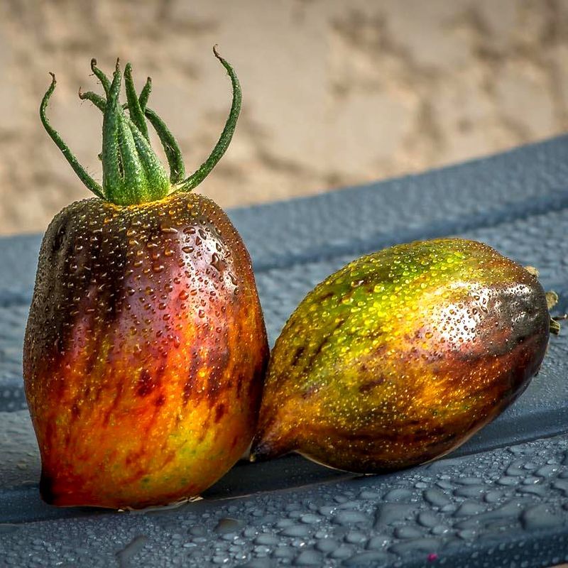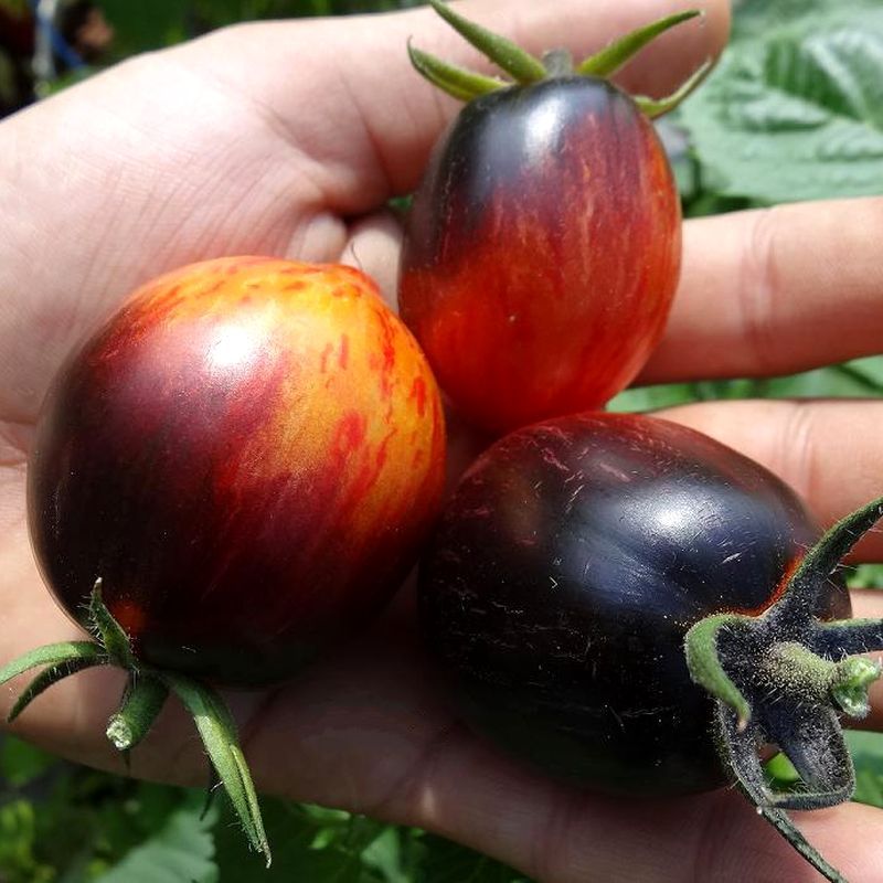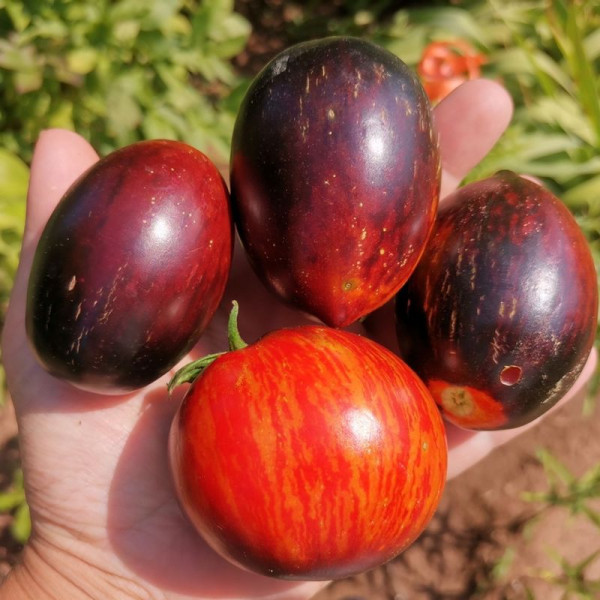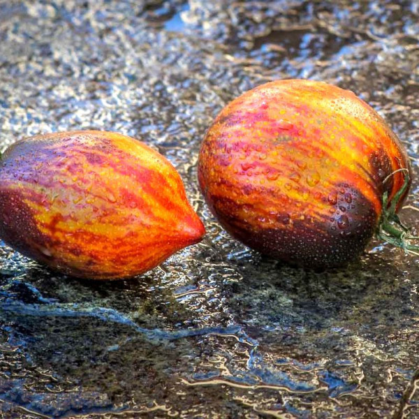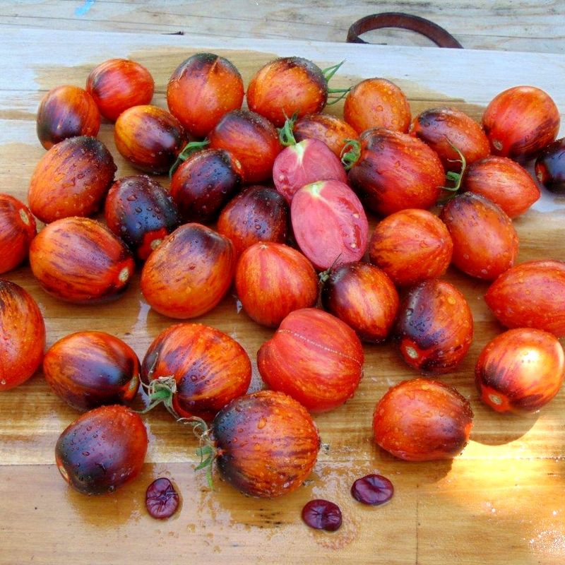Плоди невеликі, сливовидні, деякі з тупим носиком, із щільною шкіркою. У стадії зрілості вони оранжево-червоні з фіолетовими плямами та штрихами, вагою 100-120 грамів, солодкі, соковиті, з фруктовою ноткою у смаку. Ці помідори підходять для свіжого споживання, цільноплідного консервування, в'ялення. Антоціана на плодах тим більше, що більше дістається їм сонячного світла.