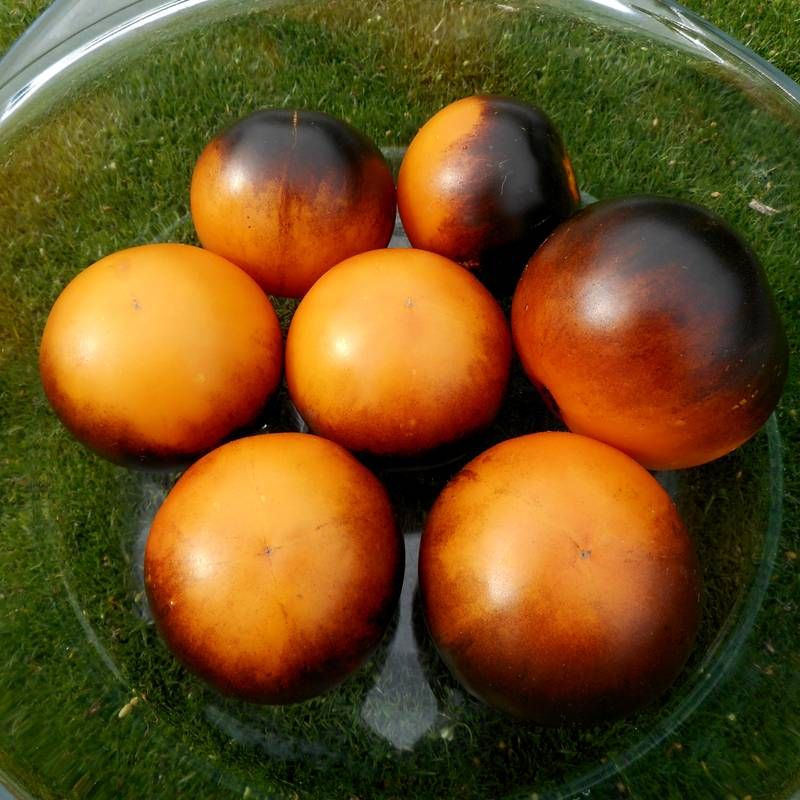 Томат «Блакитний апельсин» (Orange Blue) – середньостиглий індетермінантний сорт, висотою 1,5м. Екзотичні плоди оранжево-золотистого кольору, округлі, покриті з боку плодоніжки чорно-фіолетовою засмагою, вагою 50-120 грамів. Кисті зберігають зав'язь за несприятливих кліматичних умов.