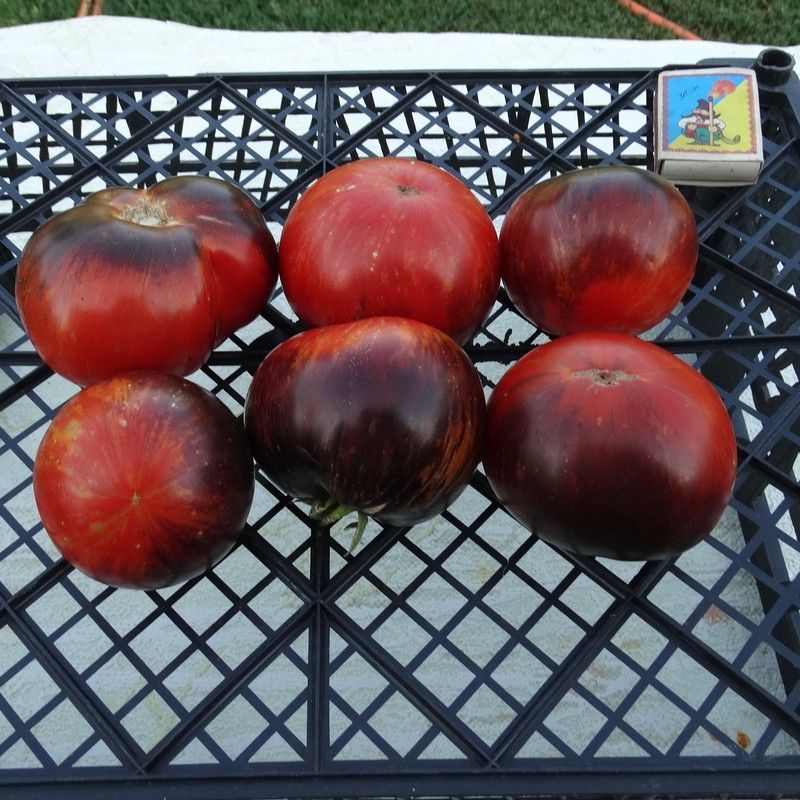 Томат «Чорна тінь» (Black shadow) – ранній, високорослий (до 1,8 метра), урожайний сорт. Плоди дуже красиві, яскраво червоні з антоціаном та золотистими смужками, вагою 80-200 грамів. Плоди строкаті, округлі, червоно-сині, не тріскаються, не гниють, не хворіють, дуже щільні, соковиті, відмінного, насиченого гармонійного смаку. Дуже незвичайні товсті кисті повинні витримати будь-яку вагу плодів. Дуже декоративний гатунок.