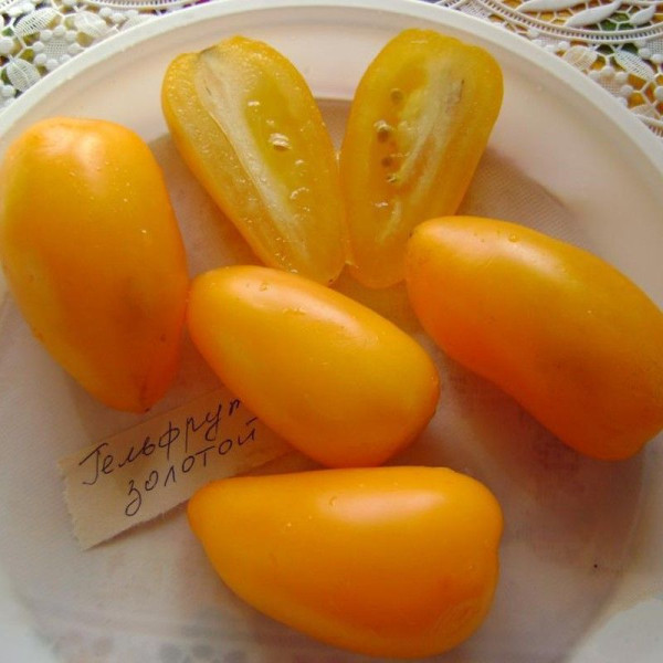 Томат «Гельфрут золотий» – ранньостиглий високоврожайний сорт. Кущі висотою близько 60 см. Плоди подовжені, красиві, солодкі, жовтого забарвлення, вагою 80-100 грамів, дуже смачні у свіжому вигляді. Напрочуд врожайний. Чудово підходять для консервації.
