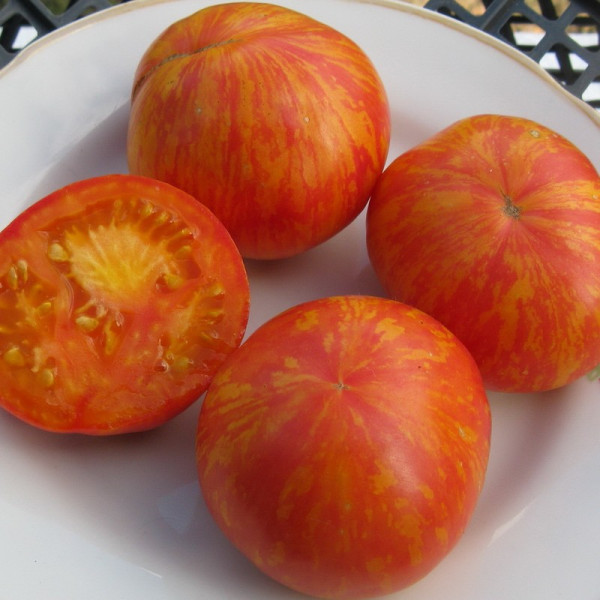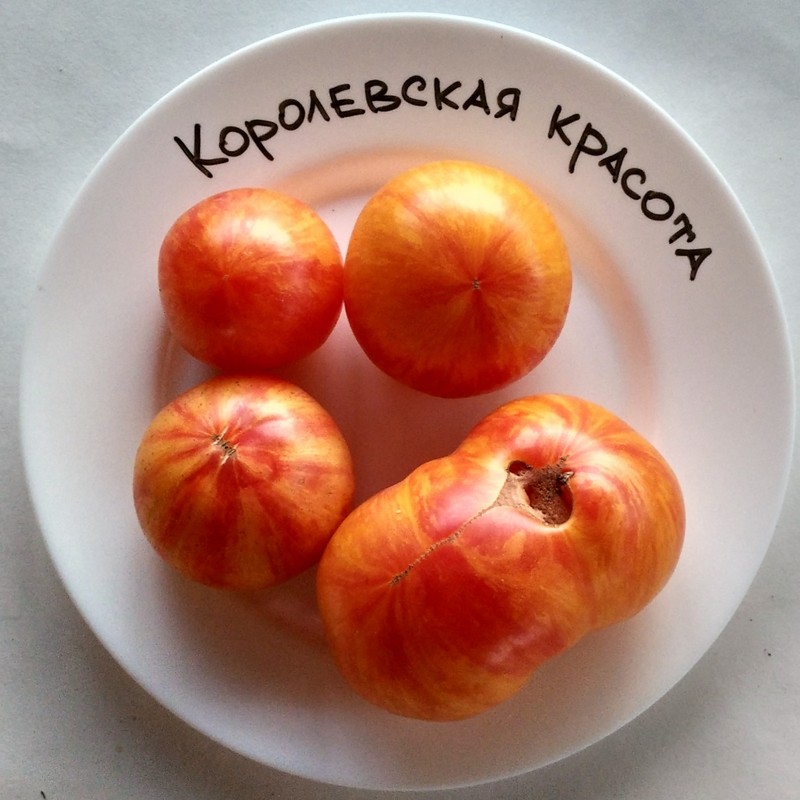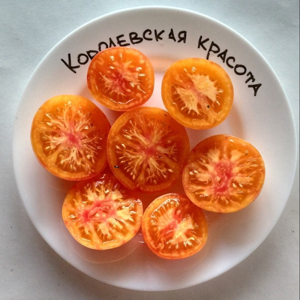 Томат «Королівська краса» – дозріваність – 110-115 днів. Індетермінантний, кущ заввишки до 1,8 м. Потребує підв'язки до опори. Плоди плоско-округлої форми, червоно-жовтогарячі з рожевими розлученнями, масою 150-200 грамів. Солодкі, запашні.