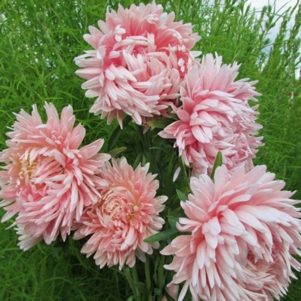Астра піоноподібна «Яніна» - однорічна рослина з потужними прямостоячими стеблами, висотою 60-80см. Суцвіття густомахрові, діаметром 8-12см, рожево-жовтогарячого забарвлення. На одній рослині формується до 20 суцвіть. Використовується для декоративного оформлення клумб, квітників та зрізання у букети.