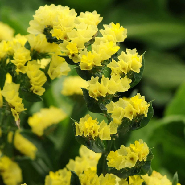Лимоніум жовтий (статиця, кермек) / Limonium mill - це однорічна рослина. Стебла прямостоячі, висотою 60-70 см, з розгалуженими у верхній частині. Квіти невеликі, до 1 см у діаметрі, жовтого забарвлення, зібрані у щиткоподібні суцвіття. Відрізняється рясним цвітінням з липня.