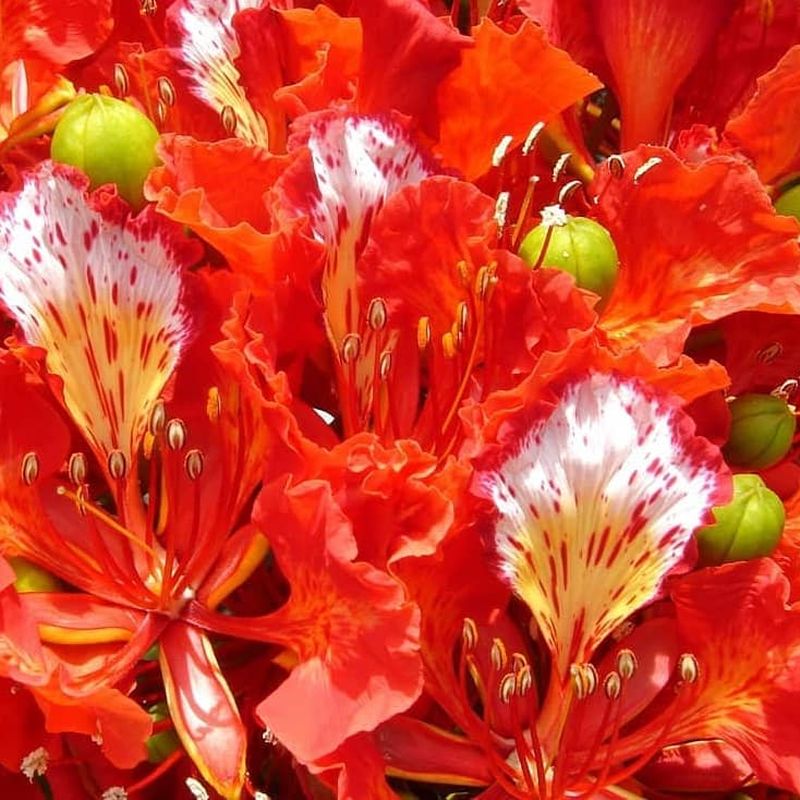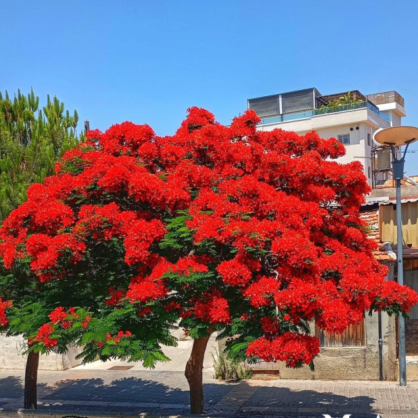 Вогняне дерево або королівський делонікс / Delonix regia - це напіввічнозелене дерево виростає до 10 метрів заввишки, з широкою кроною, схожою на парасольку. Його елегантне яскраво-зелене двічіперисте листя довжиною 30–50 см згортається вночі.