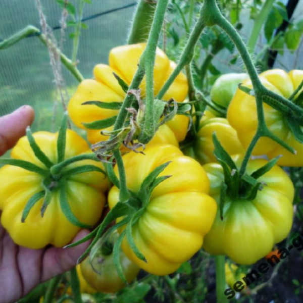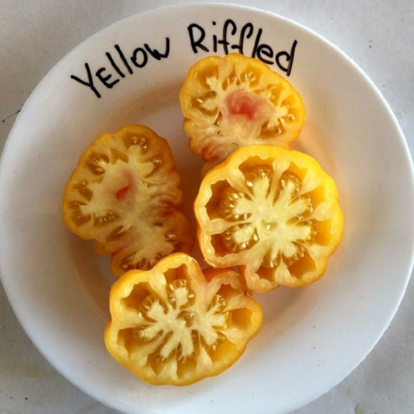 Томат «Жовтий ребристий» (Yellow riffled, Йеллоу рифлуд) - це середньостиглий сорт. Кущ високорослий, висотою 1,8 м. Плоди ребристі, гладкі, жовтого кольору, масою 500 грам, дуже красиві, виняткової врожайності та хворобостійкості. Плоди солодкі, цупкі, м'ясисті.