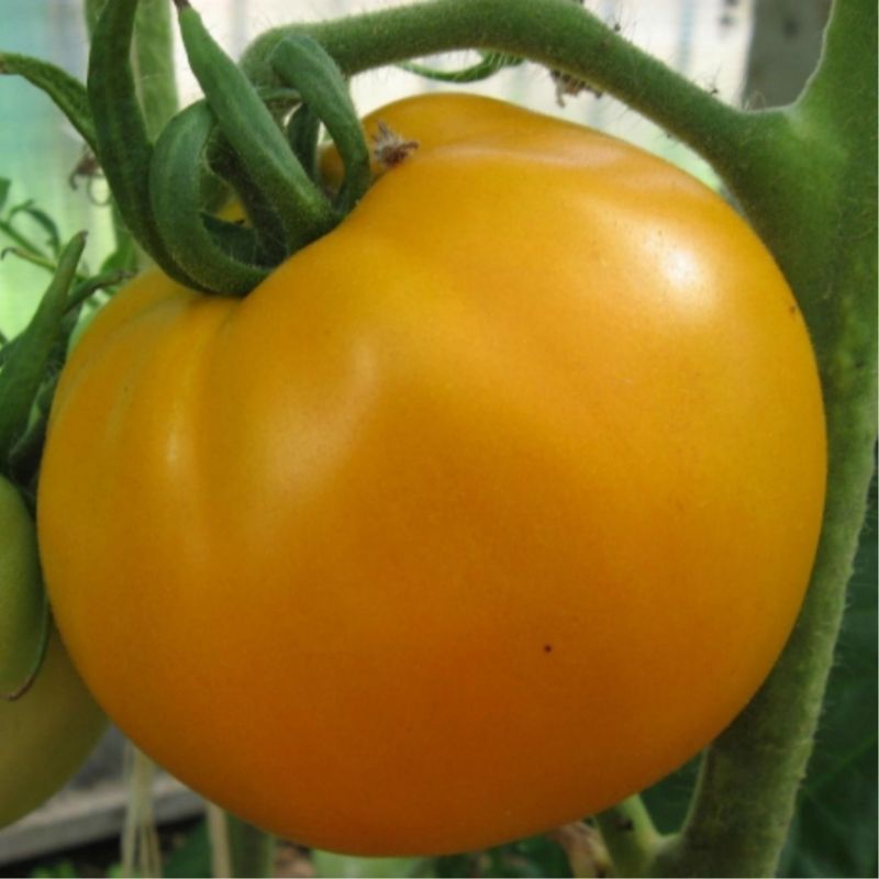 Дозрівання плодів відбувається на 102-110 день із моменту сходів. Рослина висотою до 70-80 см. Над 5-7 листком закладається перше суцвіття, через 1-2 листки - закладаються наступні. Тобто суцвіття просте. Плодоніжка із зчленуванням. Плід гладкий, плоско-круглий або круглий, 3-4 камерний. Забарвлення незрілого плоду зелене з темно-зеленою плямою у плодоніжки, а зрілого – помаранчеве. Маса одного плода від 91 до 150 грамів. У томату чудові смакові якості. У плодах помідора міститься 2,8-4,3 мг% бета-каротину.