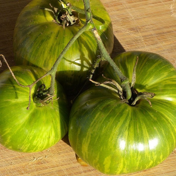The fruits are flat-round in shape, sometimes slightly ribbed, salad type. Fruit weight 150-300 grams. The fruits have an original two-tone color on a light green background, pronounced dark green strokes and stripes appear. The flesh on the cut is light green.