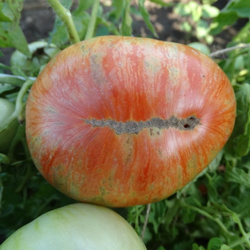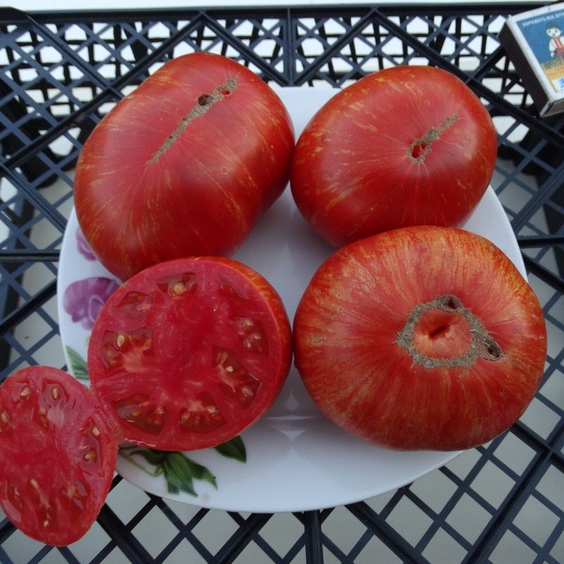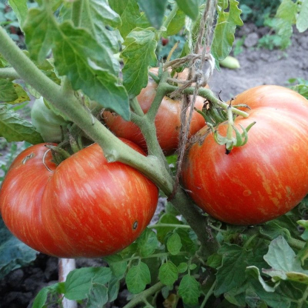 Tomato «Cherokee tiger large» - undersized, mid-season, productive variety. Bush 0.5 m high, fruits are orange-red with pink stripes, beautiful flat-rounded shape, weighing 150-200 grams with a slight ribbing and no green spot. Juicy, sweet and sour, delicious.