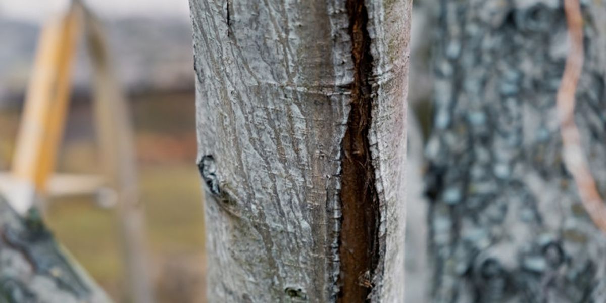Clean all detected damage with a sharp knife down to healthy tissue, then treat the wound with 3% Bordeaux mixture, 3% copper sulfate, or industrial fungicides. Then cover the crack with a healing agent or a mixture of clay with manure in a 6:4 ratio. After treatment, wrap the frost crack with burlap, garden bandage, or other breathable material and tighten with wire to hold the edges of the wound together. This treatment will help prevent further tissue destruction.