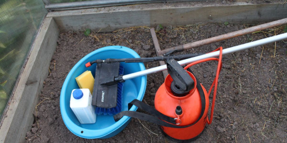 If plants in the greenhouse were heavily diseased last year, it is better to use industrial disinfectants for washing. Apply the working solution to the walls and frame of the greenhouse and wait 30–40 minutes, then wash with a soft brush or sponge and rinse with water from a hose.