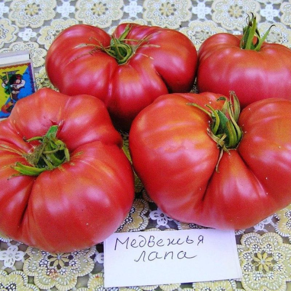 Томат «Медвежья лапа» - высокорослый сорт. Мощное растение, достигает высоты 2-2,5м. Плоды округло-сплюснутые, красные весом 900 грамм и более. Опора для этого сорта требуется мощная, так как на одном кусту бывает более 30 кг плодов. Вкусовые качества высокие, срок созревания 120-125 дней. Использование универсальное. Выращивается рассадным способом.