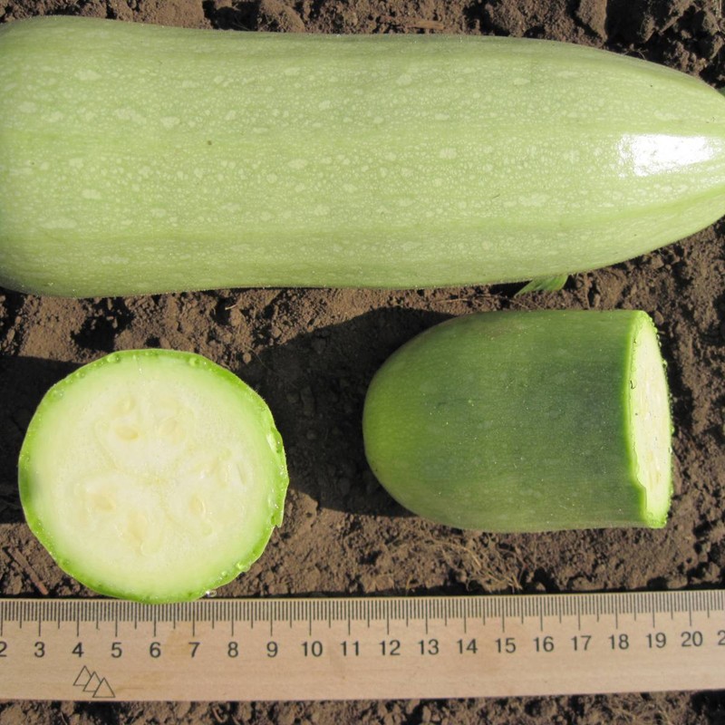 Плоды цилиндрической формы, удлиненные, гладкие, слегка ребристые у плодоножки, в технической спелости бледно-зеленого цвета, мякоть белого цвета, плотная, габитус растения - компактный, кустовой.