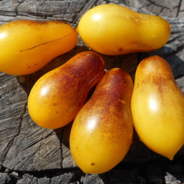 Плоды грушевидные, в технической спелости чернильно-сиреневые, а при полном созревании оранжево-желтые с коричневыми штрихами антоциана, массой 20-40 грамм. Вкус сладкий с гармоничной кислинкой, как изюм. Для свежего потребления, украшения блюд, заморозки и томатной переработки.