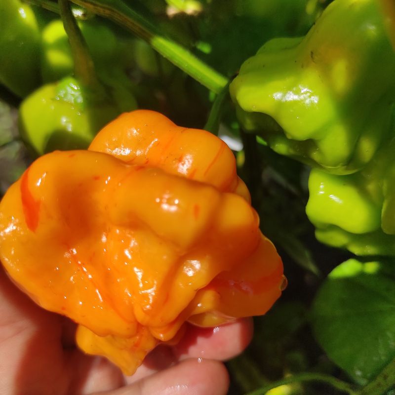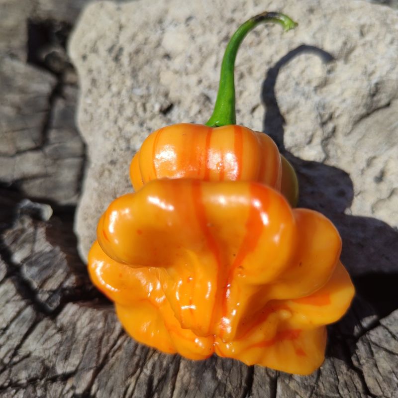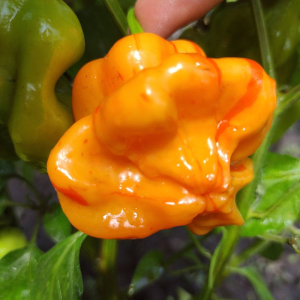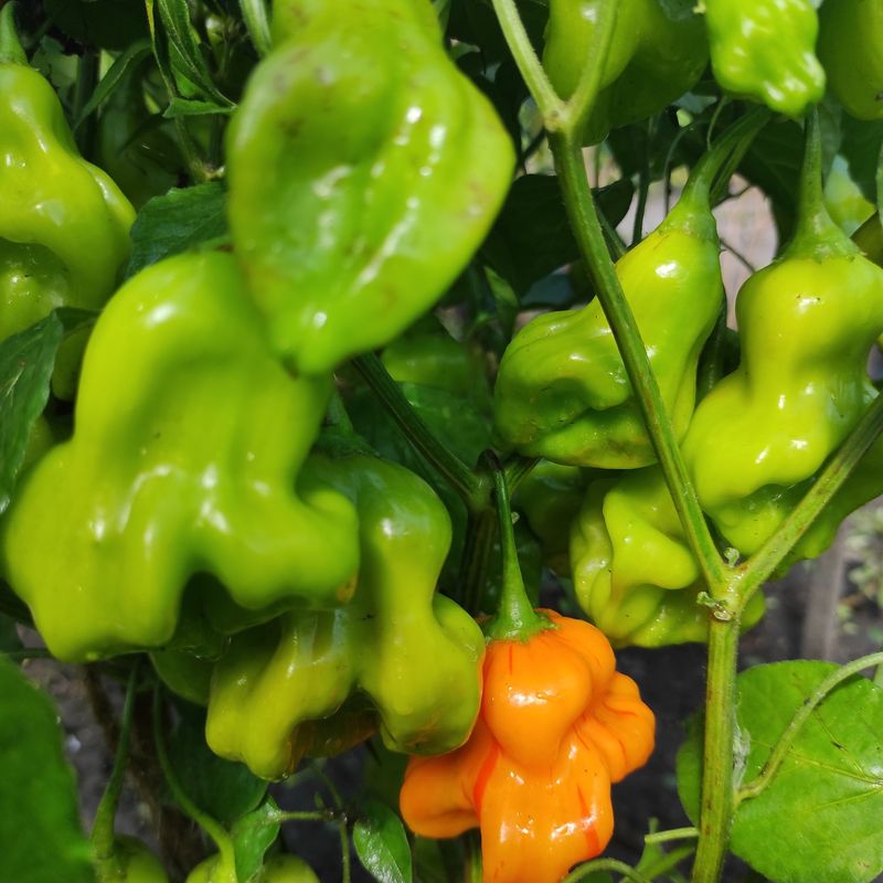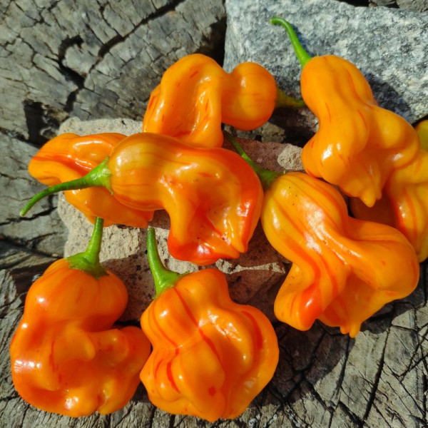 Высота куста 1м, плоды имеют форму колокольчика, средние по размеру, длиной 5-6 см, яркого оранжевого цвета с красными полосками. Мякоть у плода с фруктово-ягодным ароматом и сладким вкусом, одним словом не зря этот перец относится к виду ягодному!