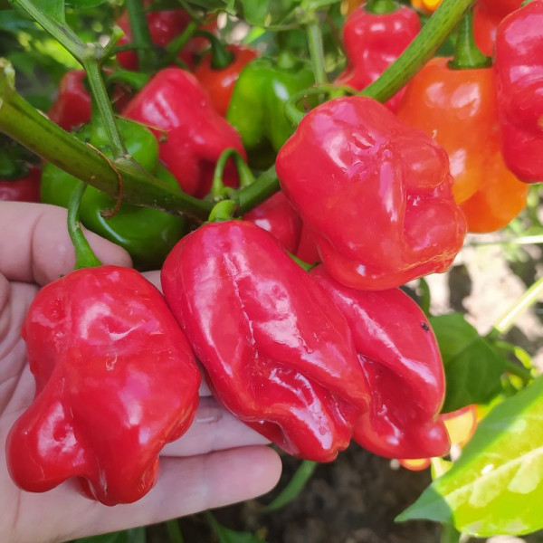 Перец острый (горький) «Хабанеро гигантский Роджер оранжевый» (Habanero Roger's giant orange) - среднеспелый очень урожайный сорт. Созревает через 110 дней от высадки рассады. Куст широкий, высота 80см. Плоды размером с небольшое яблоко, тяжелые и могут достигать 40-50 грамм, они с хорошим вкусом и ароматом. Плоды растут по 2-3 штуки в каждом узле, стенки толстые, сочная мякоть, приятный аромат тропических фруктов.