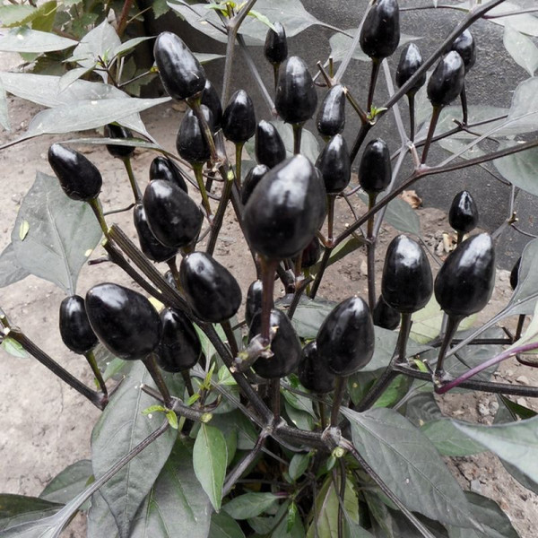 Перец острый (горький) «Черная Оливка» (Ornamental Black Olive) - среднеспелый сорт. Срок созревания плодов 120 дней. Очень приятное, компактное урожайное растение, покрытое темно-зелеными листьями с привлекательными фиолетовыми цветами и черными, глянцевыми плодами похожими на оливки. При полном созревании плоды становятся темно-красными. Высота куста 40-50 см. Красивое и съедобное украшение подоконника, можно выращивать в цветочных горшках.