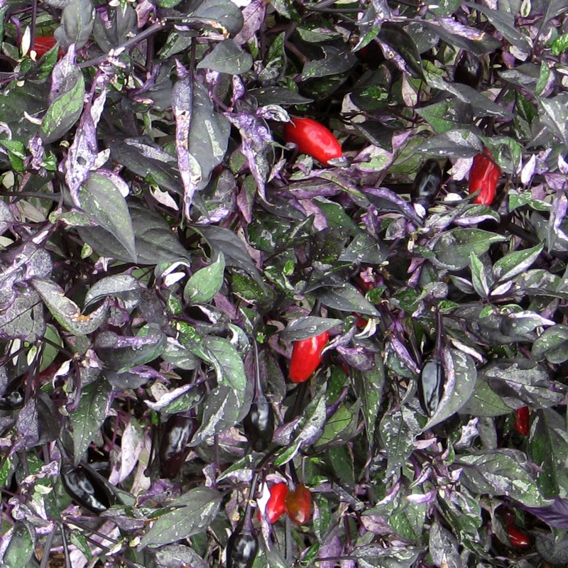 Перец горький (острый) «Пестролистный коленкор» - карликовый острый перец. Кустик низкорослый, высота до 15 см, весь пестрый. Хорошо формирует пышный куст, даже без прищипывания верхушки. Плоды меняют цвет с темно-фиолетового до ярко-красного.