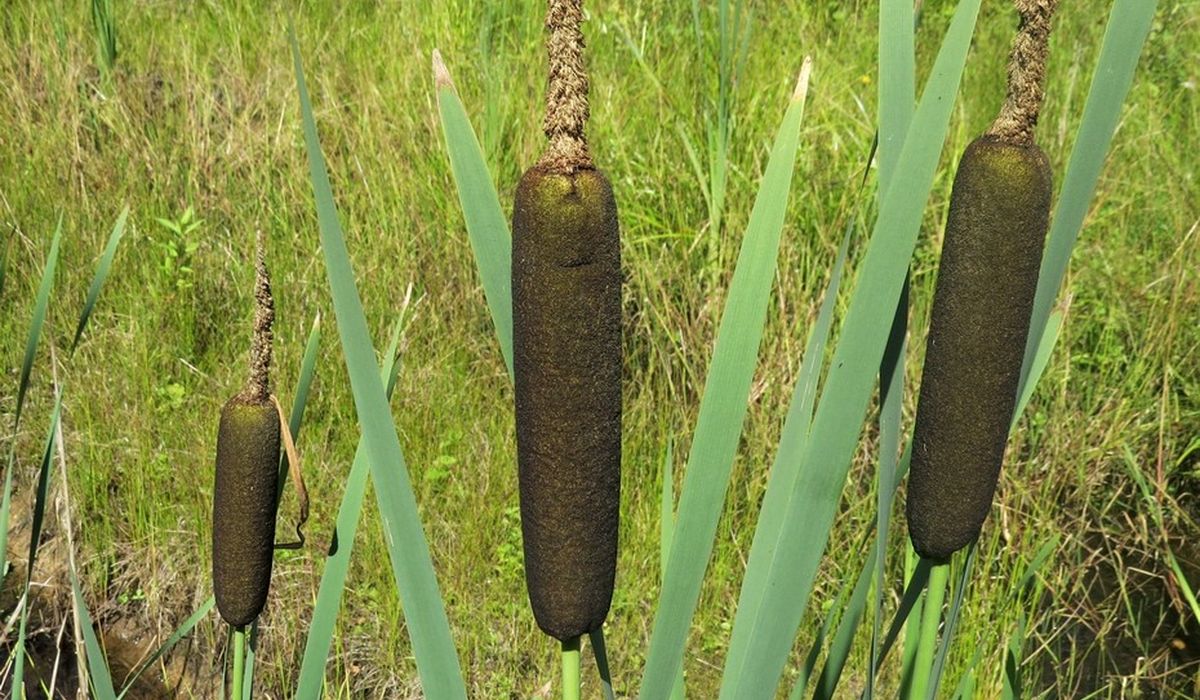 - Рогоз — растение с характерным бурым початком, жёсткими листьями и ценным пухом.
